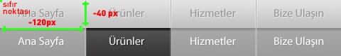 Sistem yukarıdaki mantık ile yürür. Genişliği ve yüksekliği belli olan alanın genel resimdeki konumunu belirterek menümüzü oluşturduk. Yukarıdaki örnek resimde "Ürünler"in fare üzerine geldiğindeki(:hover) görüntüsünü elde etmek için resimdeki konumu yukarıdan -40px, soldan -120px olarak atamalıyız. Ardalan konumu belirlerken resmin sıfır noktası sol üst köşesidir, bu nedenle değerler eksi(-) değer alır.