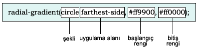 Doğrusal renk geçişinde olduğu gibi tanımladığımız renk geçişlerini ufak bir özellik ismi değişimi ile tekrarını sağlayabiliyoruz.