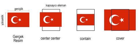Yukarıdaki grafikte görüldüğü gibi gerçek resmin genişliği büyük, yüksekliği küçüktür. contain tanımlandığında genişlik ve yükseklikten büyük olanı yani burada genişliğin uzunluğu kapsayıcı genişliğine sığıncaya kadar orantılı şekilde küçültülerek atanmış. Kapsayıcı elemanın üst ve at kısmı boş kaldı.