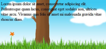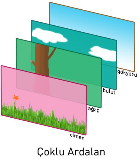 Her biri ayrı ayrı olan resimler(çimen, ağaç, bulut ve gökyüzü) üst üste koyarak bir resmi elde edeceğiz. Örneği aldığımız sitede bu resme hareketde kazandırılmıştır, ancak bizim konumuz olmadığı için işin bu kısmına girmeyeceğiz.
