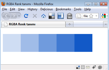 {% highlight css %} p.renk1{ background-color:rgba(18,89,199,0.2); width:70px; height:70px} p.renk2{ background-color:rgba(18,89,199,0.4); width:70px; height:70px} p.renk3{ background-color:rgba(18,89,199,0.6); width:70px; height:70px} p.renk4{ background-color:rgba(18,89,199,0.8); width:70px; height:70px} p.renk5{ background-color:rgba(18,89,199,1); width:70px; height:70px} {% endhighlight %}