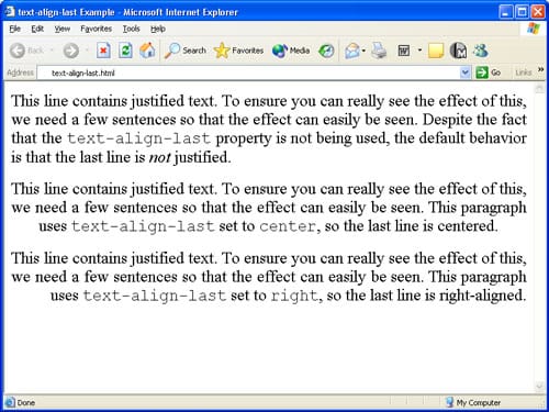 {% highlight css %} p { text-align: justify; -ms-text-align-last: right; } {% endhighlight %}