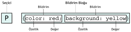 CSS'in yapısı iki ana kısımdan oluşur. Seçiciler(Selector) ve Bildirim Bloğu(Declaration Block). Bildirim Bloğuda iki ye ayrılır. Özellik(Property) ve Değer(Value).