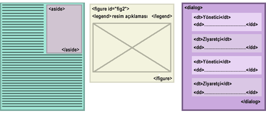 aside: İçerik ile ilişkili ayrıntılar, notlar vb alanlar için içeriğin yanına iliştirilmiş alanları tanımlamak için kullanabiliriz. figure: Genelde kullandığımız şekil ve açıklaması için eklenmiş güzel element. Hem şekil hemde açıklmasını içeren bir element dialog: Bu element ismindende anlaşıldığı gibi diyalog, karşıklık sohbet içeren sayfaları daha kolay kodlamamız için eklenmiştir. Bu element <dd> ve <dt> elementlerini alt element olarak kullanır.