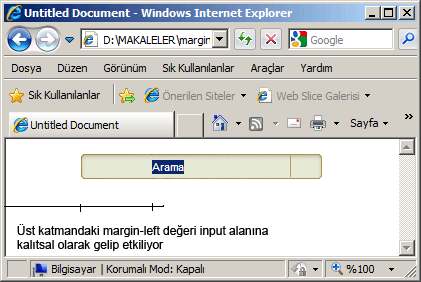 Böyle bir kod yazıyorum. Dıştaki div(div.dis) herhangi bir kapsayıcı div olarak düşünün. Sayfanın diğer bir öğesi yani bu arama kısmı ile alakası yok. Bu kapsayıcı katmandaki margin tanımı ie'de sorun çıkarıyor.