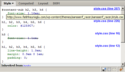 Gelelim küçük ipucumu yazmama neden olan kısıma. FireBug'da beni cezbeden şey, ayrıntılarında bir çok avantajın gizli olması. Bunlardan biri seçtiğimiz elemanı etkilyen tanımların hangi doküman içinde yer aldığını göstermesi ve hangi satırda olduğunu belirtmesi. Belki küçük bir ayrıntı ama benim çok işime yarıyor. Hemde çok.