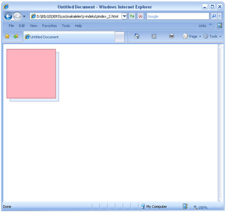 Yukarıda örnekte görüldüğü gibi katmanlar üst üste sıralanmıştır. Birbirinden 10px üst ve 10px soldan mesafe bırakılmıştır. Üstte kalan katman alttakileri gizlemiştir. Tüm katmanların z-index değeri atanmamıştır bu nedenle başlangıç değeri olan z-index:auto değerini almışlardır.